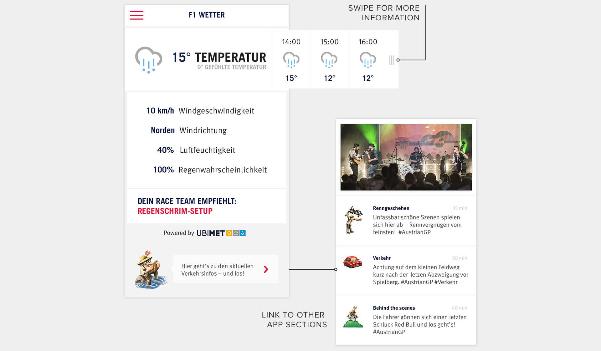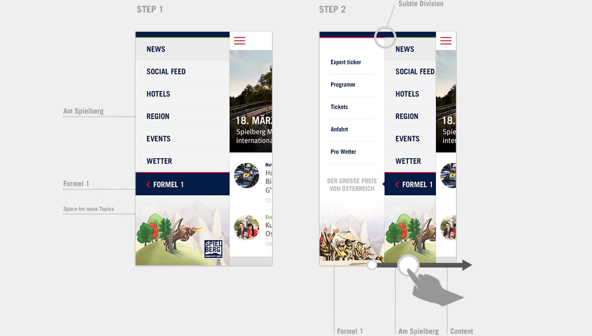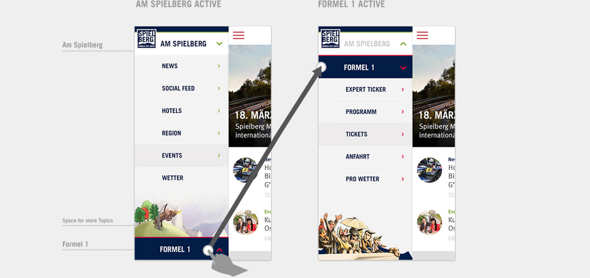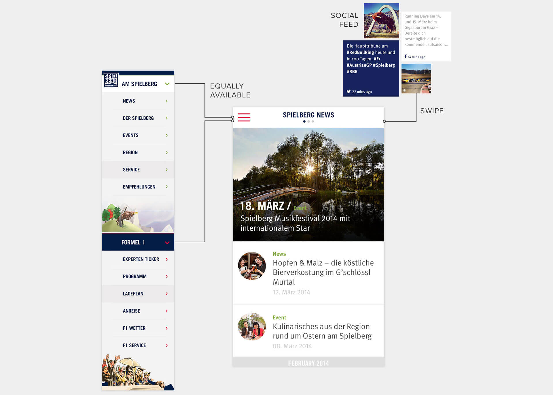 The Spielberg App was designed to be an on-site information hub for racing fans and tourists with reduced content and selected insights. All other information was available on the website which was optimised for mobile usage.